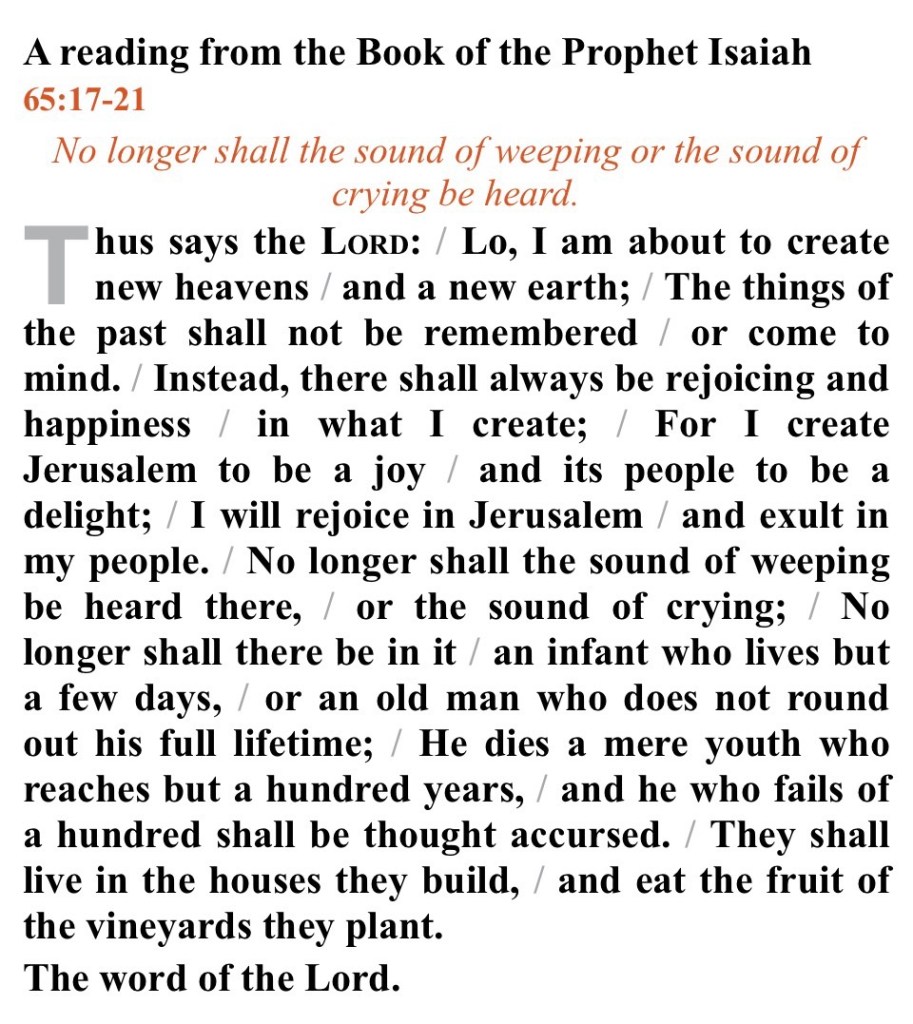 This passage from Isaiah (65:17-21), which is the Old Testament reading for mass today (March 16, 2026), is meant to be a promise of hope. The image it presents – an entirely new reality, in which the past tears are wiped away and only joy exists, where no child dies young and the norm is that we live beyond a hundred years – is meant to encourage a downtrodden people in a difficult time. It’s not like this now, but someday it will be.